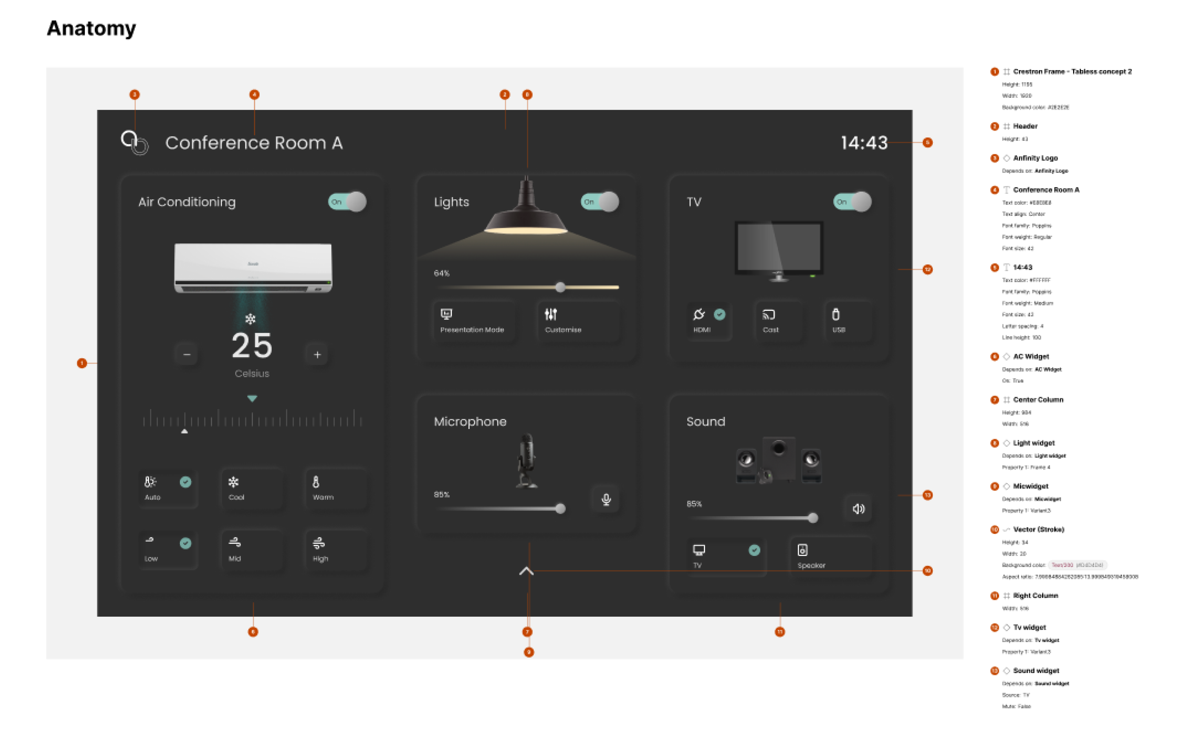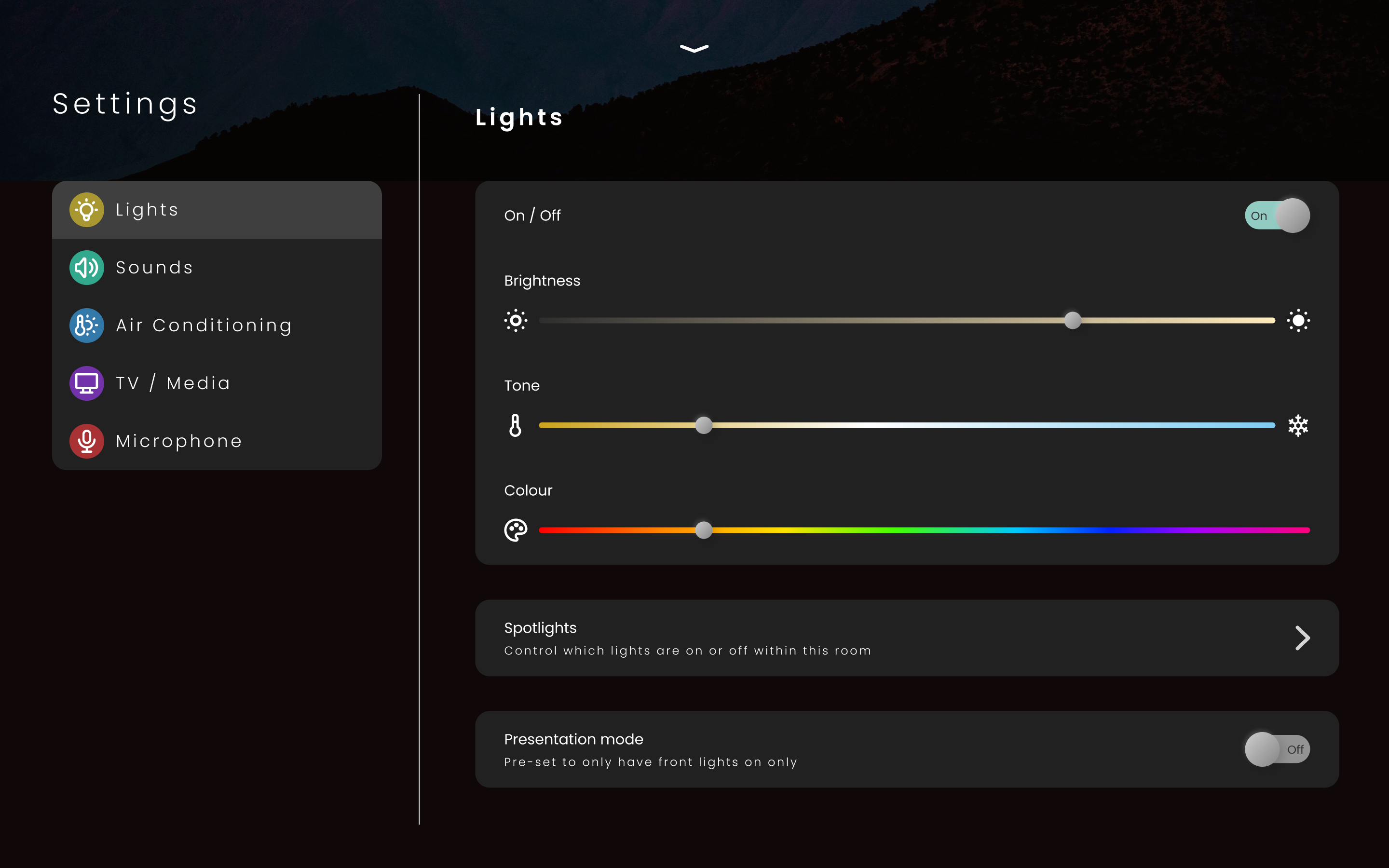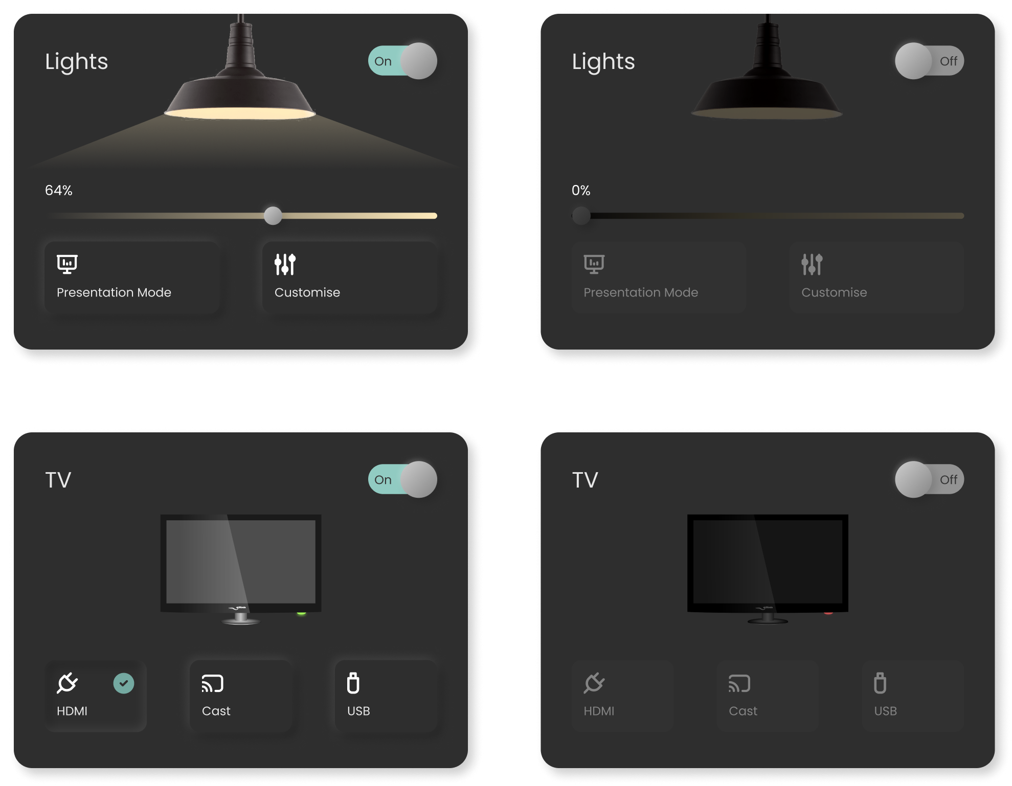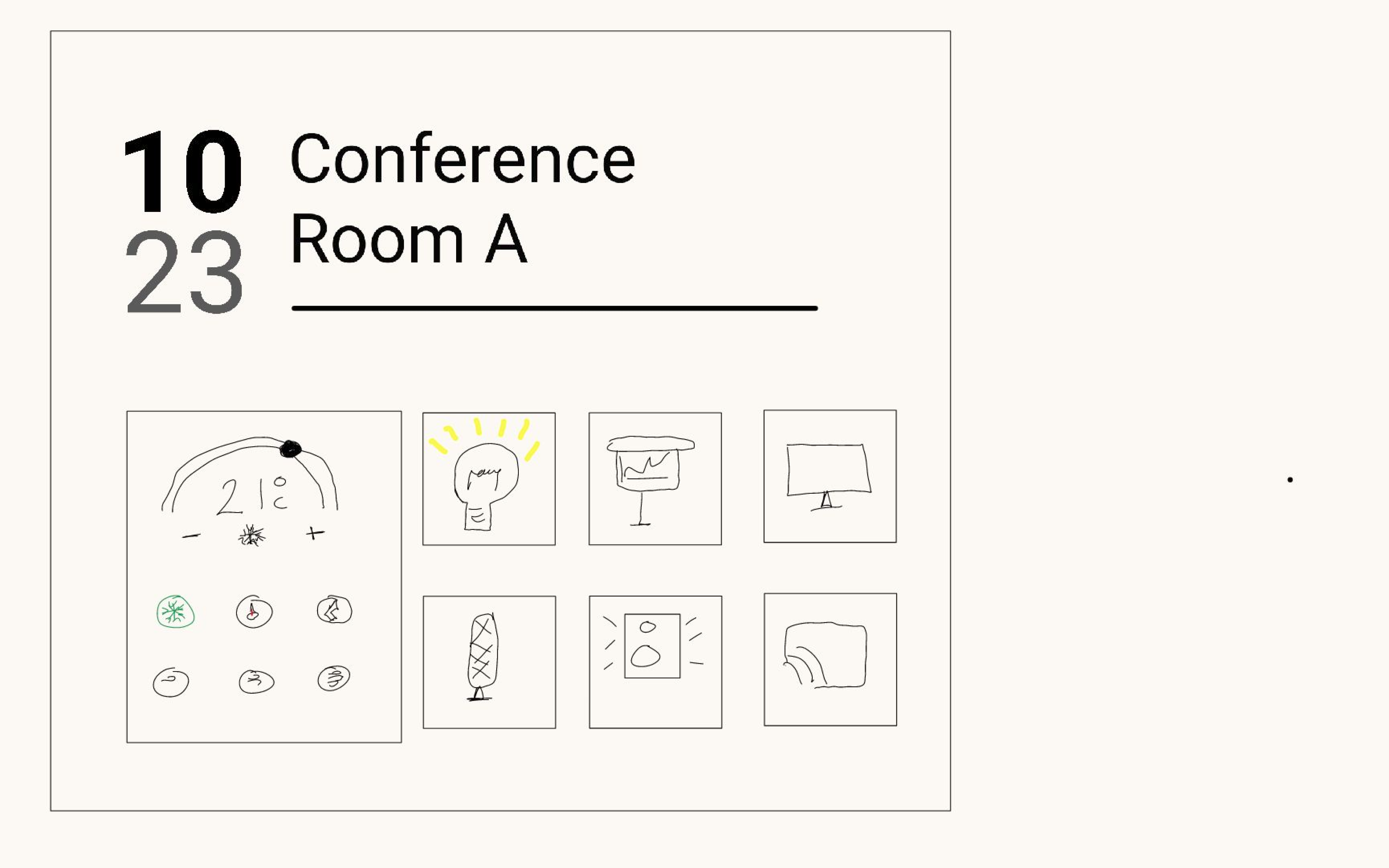 In the final concept submitted, I refined the layout to achieve a more balanced and visually stable composition. Placing the room controls along the horizontal axis created greater flexibility for future controls, offering more scalability than a vertically constrained layout. The room details—such as name, date, and time—were given improved prominence and hierarchy, making them easier for users to identify at a glance. Control label height was also increased to enhance readability, addressing earlier feedback that text appeared too small in previous iterations. The meeting scheduling feature was intentionally removed, as it was not part of the original brief; however, space remains available in the central area should this functionality be required in future iterations.
