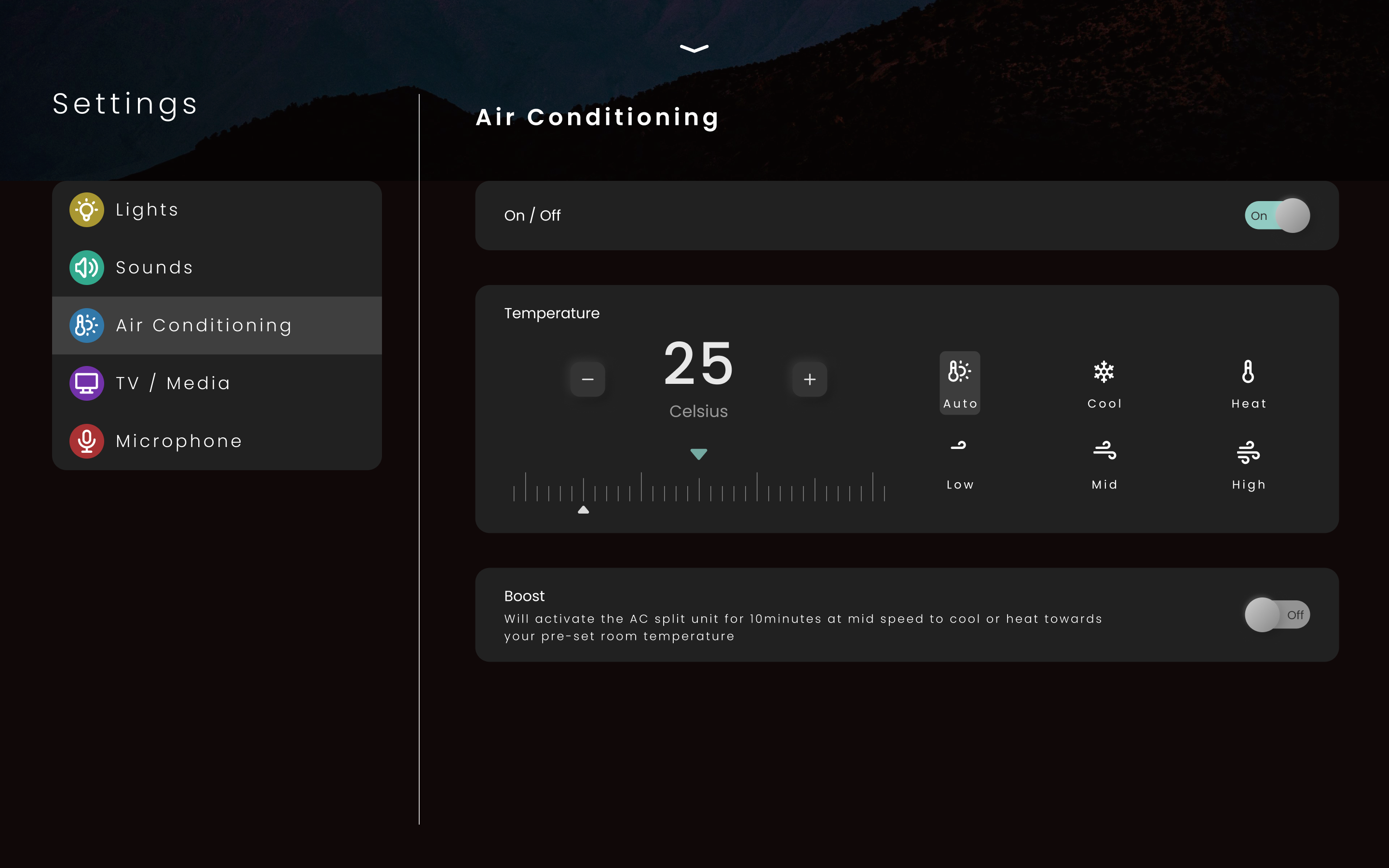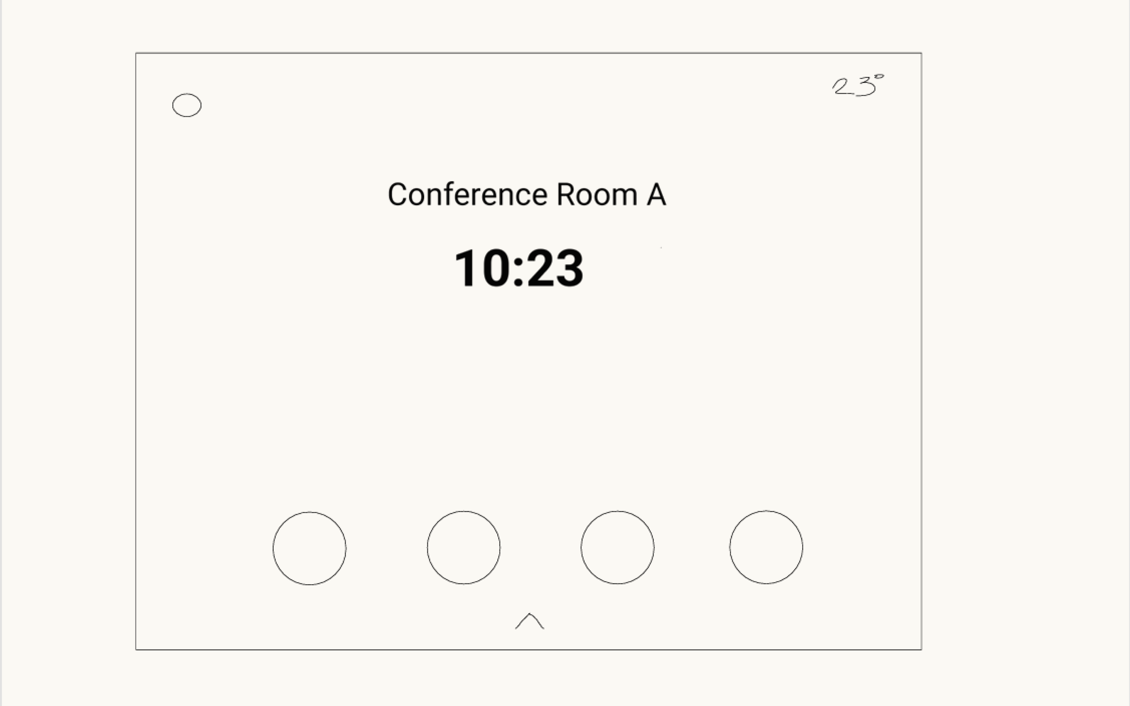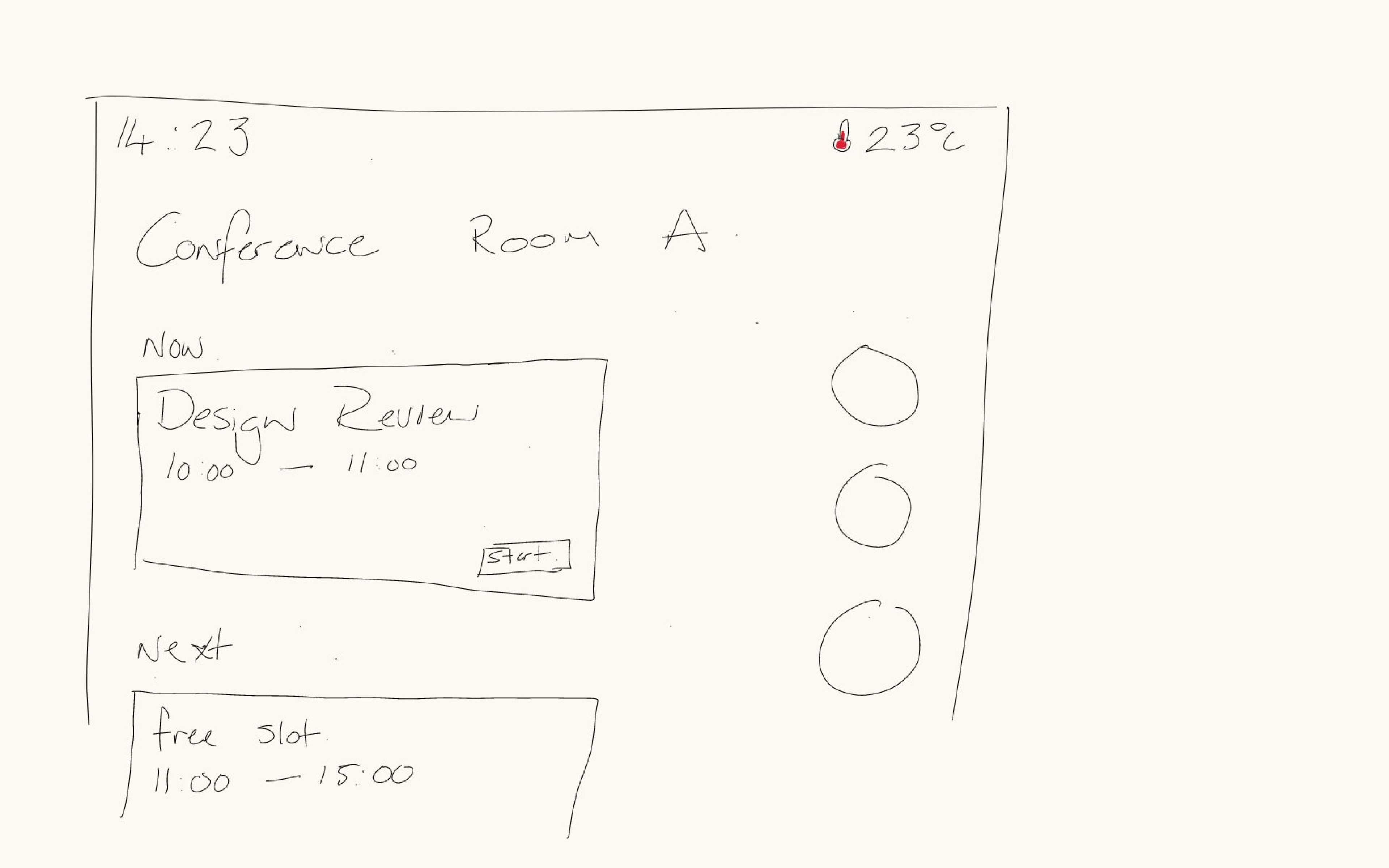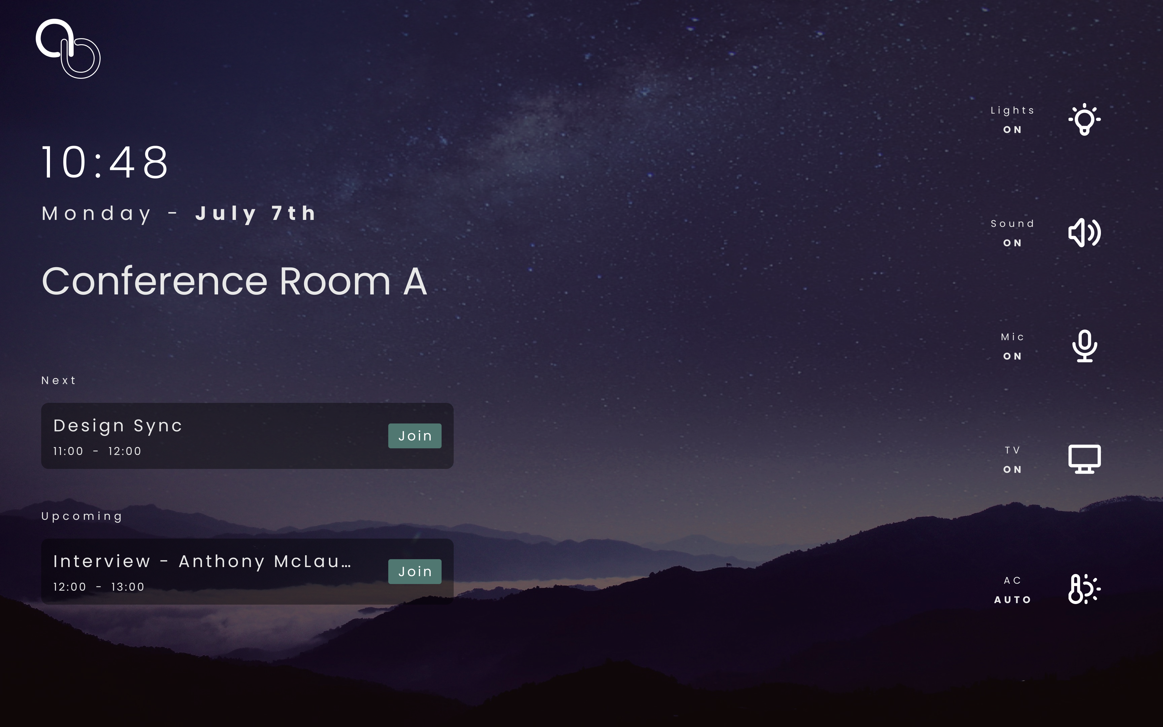 In the final concept submitted, I refined the layout to achieve a more balanced and visually stable composition. Placing the room controls along the horizontal axis created greater flexibility for future controls, offering more scalability than a vertically constrained layout. The room details—such as name, date, and time—were given improved prominence and hierarchy, making them easier for users to identify at a glance. Control label height was also increased to enhance readability, addressing earlier feedback that text appeared too small in previous iterations. The meeting scheduling feature was intentionally removed, as it was not part of the original brief; however, space remains available in the central area should this functionality be required in future iterations.