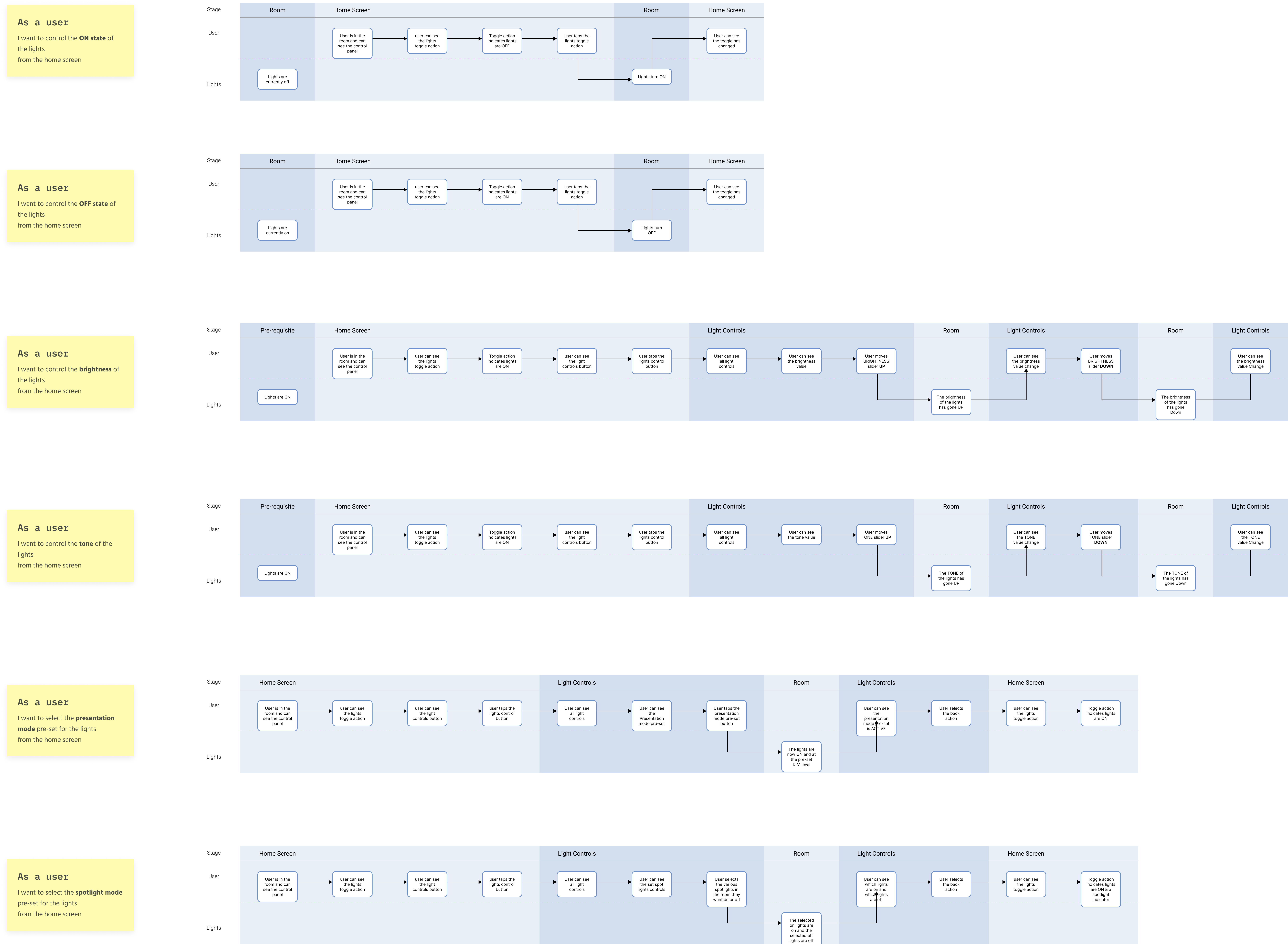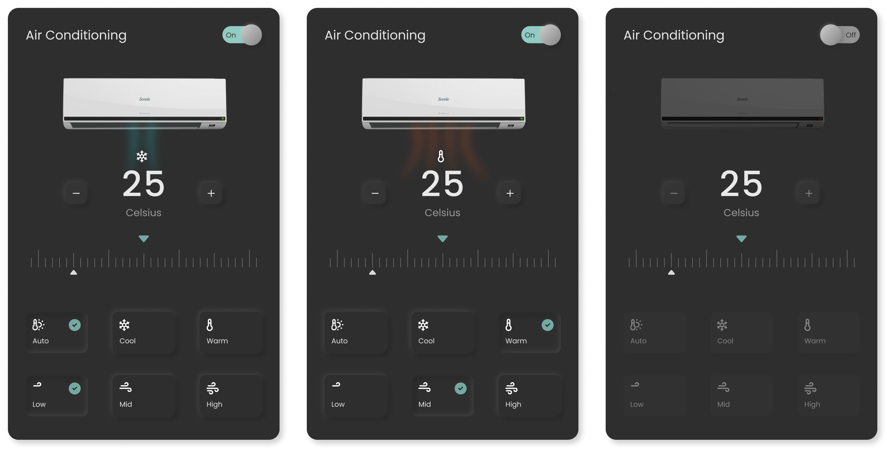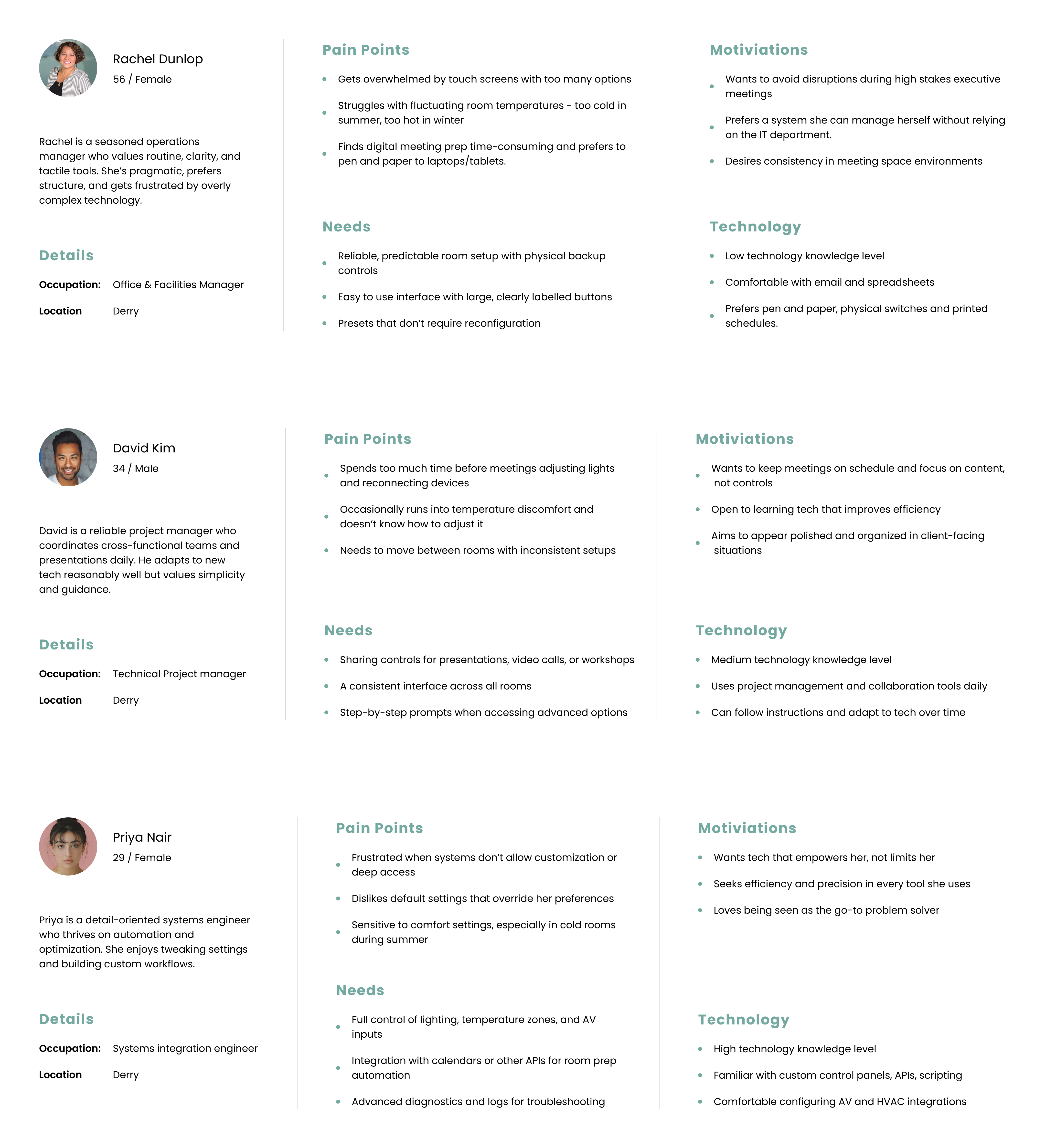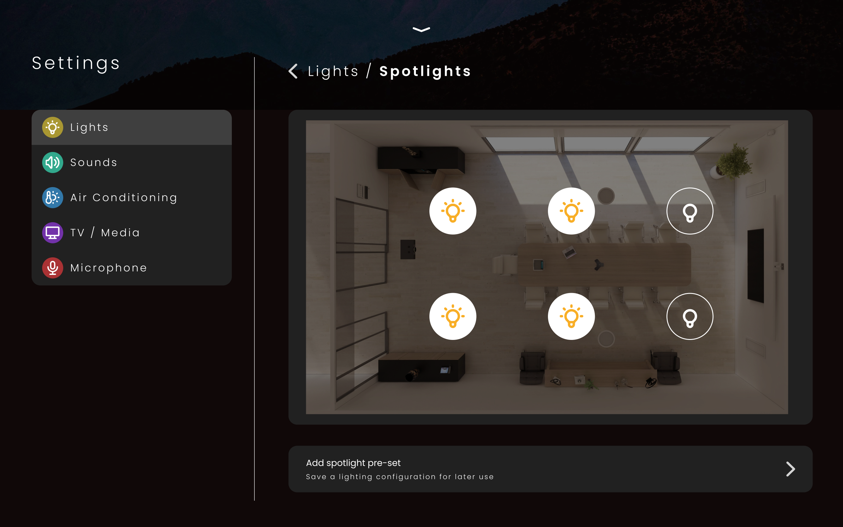 In the final concept submitted, I refined the layout to achieve a more balanced and visually stable composition. Placing the room controls along the horizontal axis created greater flexibility for future controls, offering more scalability than a vertically constrained layout. The room details—such as name, date, and time—were given improved prominence and hierarchy, making them easier for users to identify at a glance. Control label height was also increased to enhance readability, addressing earlier feedback that text appeared too small in previous iterations. The meeting scheduling feature was intentionally removed, as it was not part of the original brief; however, space remains available in the central area should this functionality be required in future iterations.