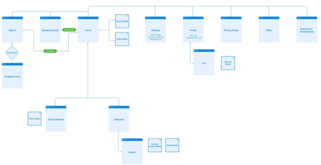 An example of the navigation flow for the Showcase site. This flow represents the initial design, which evolved through several iterations based on continuous feedback and testing.